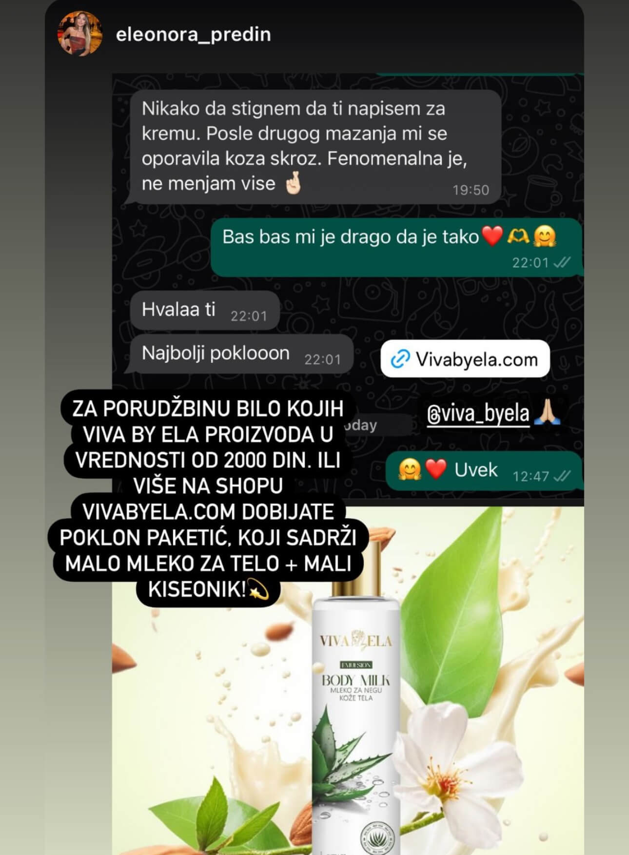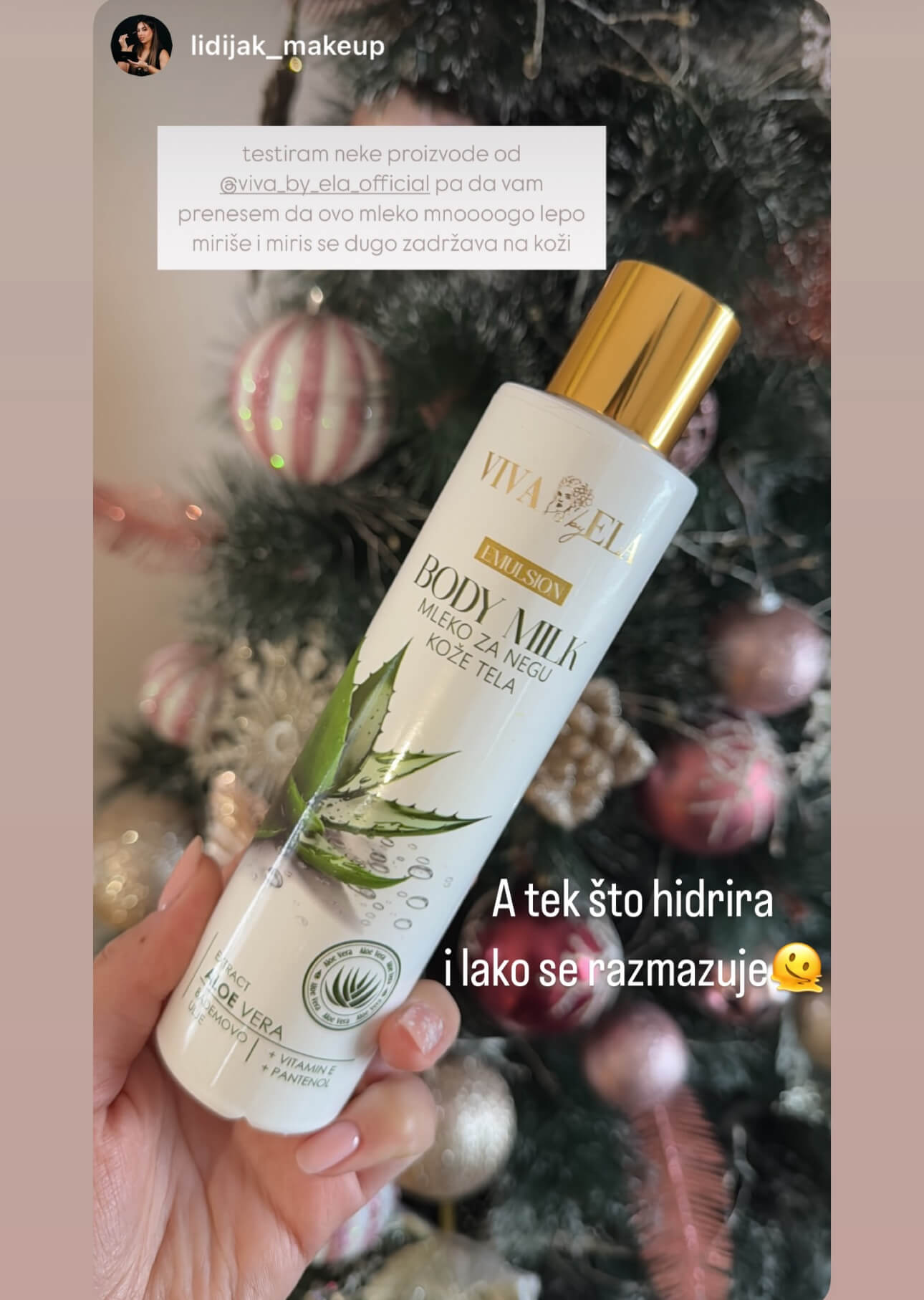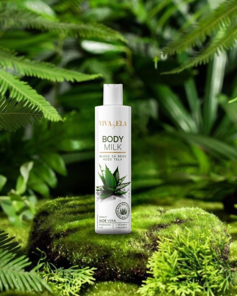 Mleko za telo Viva by Ela (body milk) sa jedinstvenom formulom na tržištu sa prirodnim uljima i sokovima lista aloe vera. Bez parabena, silikona, konzervanasa i ostalih dodataka.