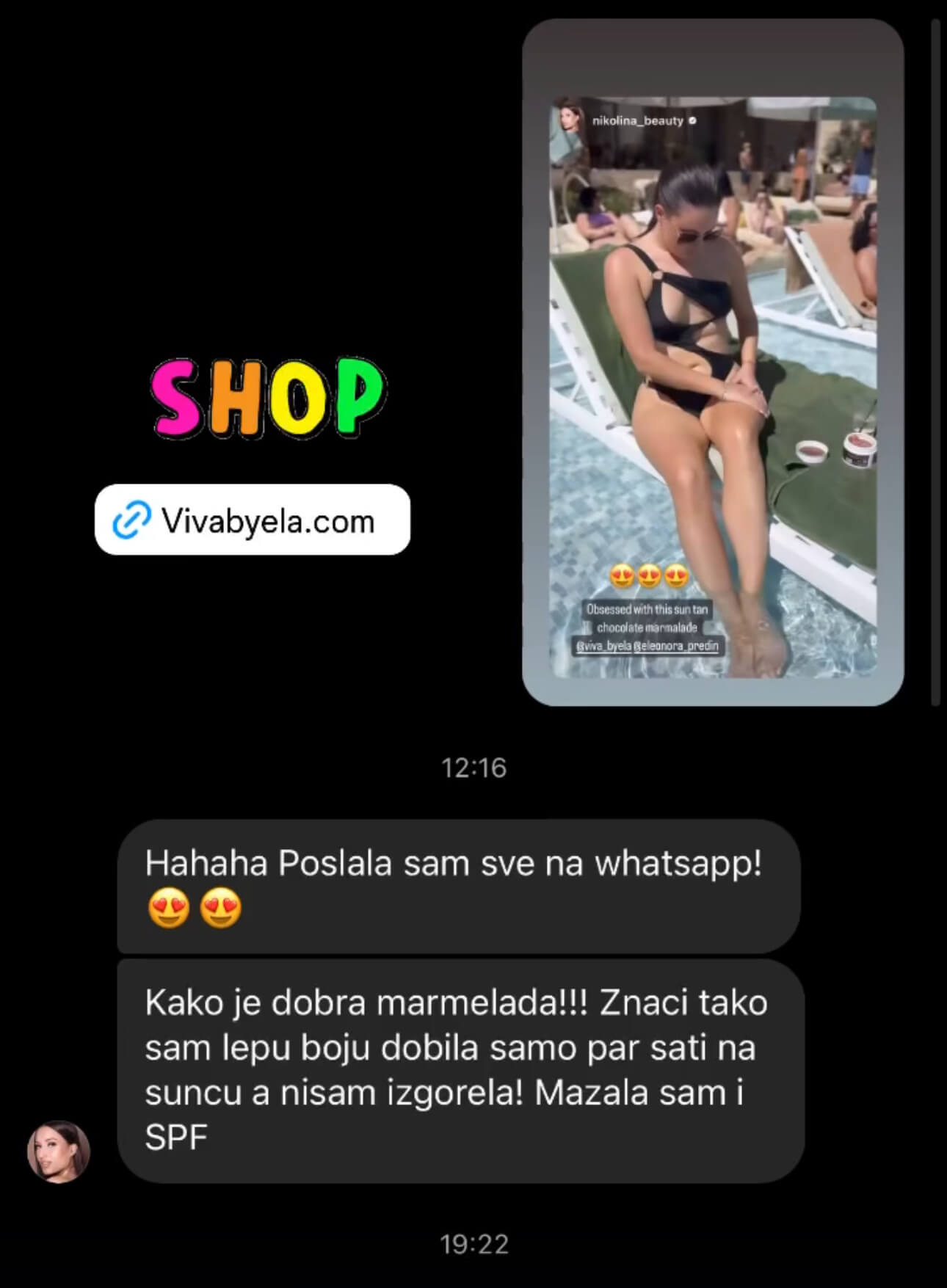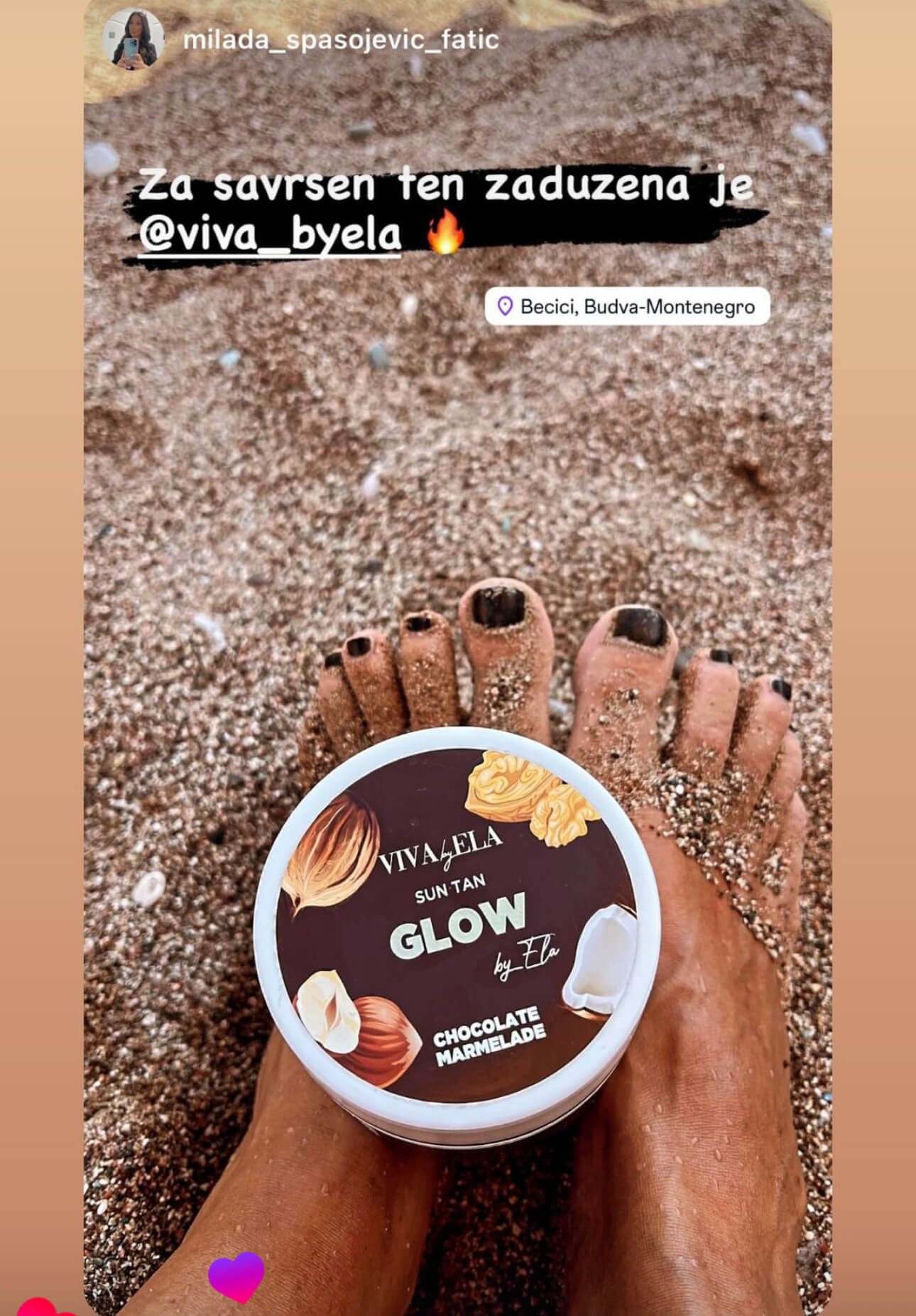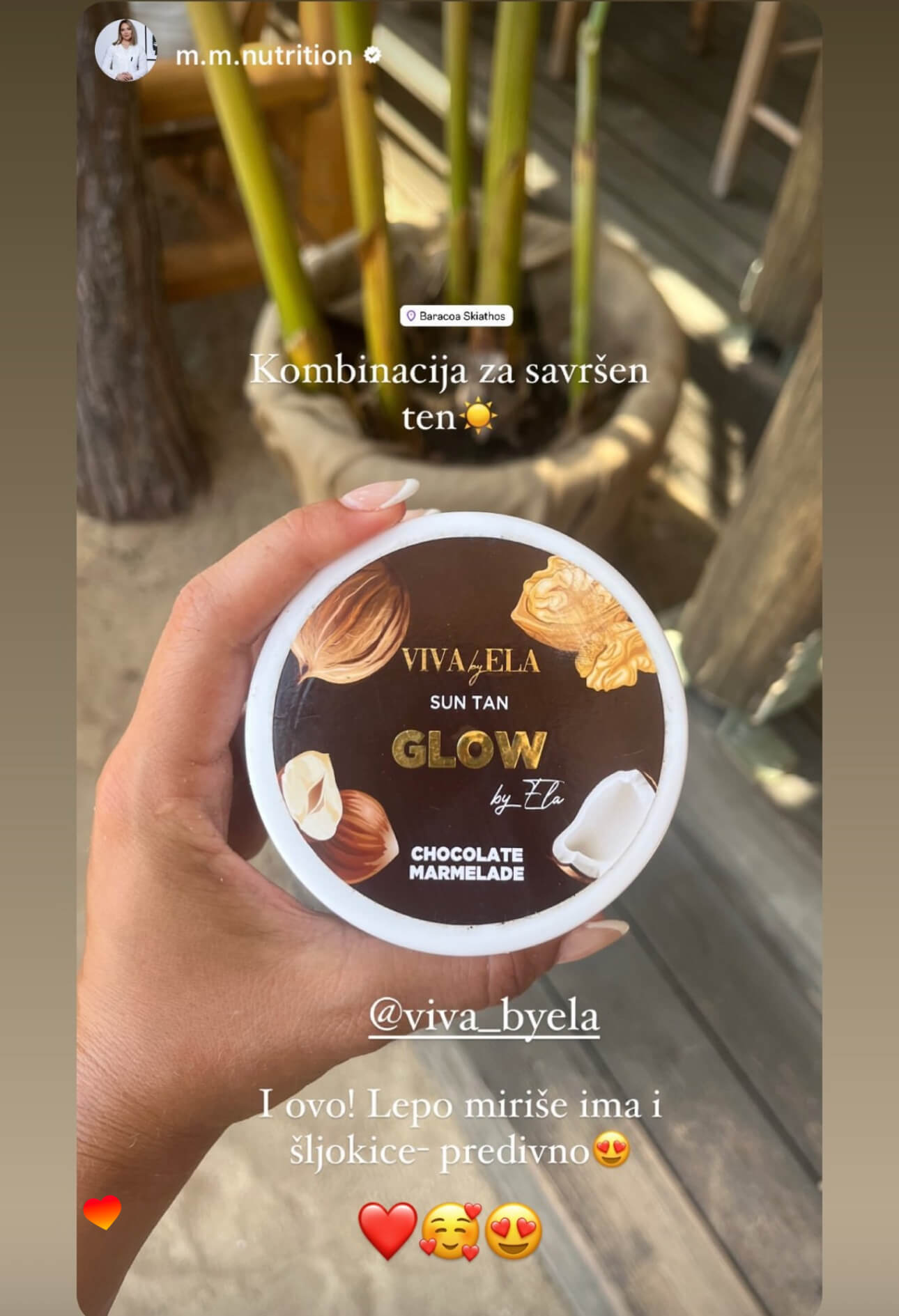 Najbolja marmelada za sunčanje i samopotamljivanje – Viva By Ela. Nega kože i postizanje bržeg i lepšeg tena tokom leta. Marmelada hrani kožu i sprečava isušivanje. Doprinosi dobijanju lepšeg i intenzivnijeg tena. Sadrži ulje kokosa, buritija i oraha. Može se koristiti i za negu kože nakon sunčanja i kao osnovna krema za negu kože tela tokom cele godine. Neto: 225ml.